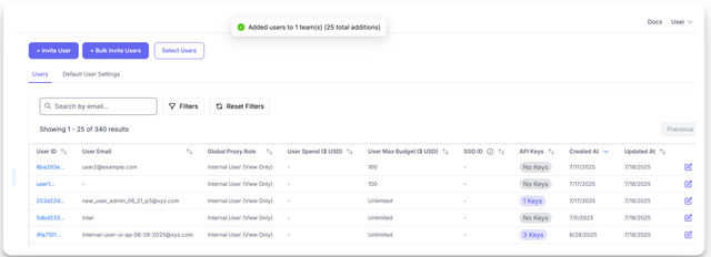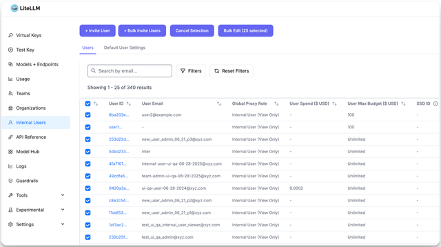 LiteLLM AI Gateway (Proxy)Admin UIBulk Edit UsersOn this pageBulk Edit Users Assign existing users to a default team and default model access. Usage​ 1. Select the users you want to edit​ 2. Select the team you want to assign to the users​ 3. Click the bulk edit button​